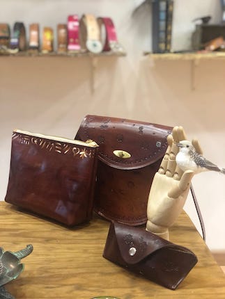Qué hacen una murciana y un madrileño en Ávila un fin de semana de invierno y con temperaturas bajo cero sin levantar la cabeza de su mesa de trabajo. El escaparate te hace entrar, es imposible no hacerlo. Su local haciendo esquina con la Plaza del Mercado Chico, centro neurálgico de la ciudad castellana, está en un lugar inmejorable para que ningún vecino o viajero se quede sin contemplar el trabajo de unos artistas artesanos que no deja indiferente a nadie. Desde sus más que realistas pajaricos que en sus jaulas árabes te hacen dudar de si están vivos o no, hasta sus maravillosos bolsos de cuero, decorados a mano con diseños que siempre tienen una razón. Los frisos descubiertos en un yacimiento arqueológico, un viejo espejo de la abuela o un traje típico de Ávila. Piel, madera, cincel y, especialmente, una vocación y empatía desbordantes.