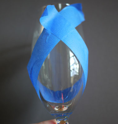 1. Corta un trozo de cinta y pégala en la copa, de forma que quede centrada en la base. Frota bien el borde de la cinta contra el cristal para que quede bien pegada.
