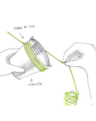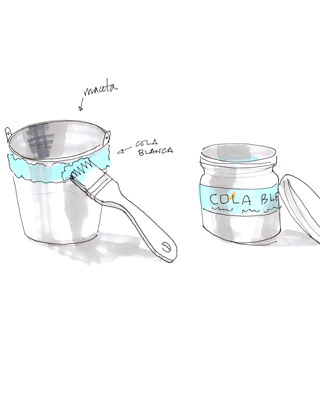 1. Mide y corta 6 tramos de 5 metros cada uno de cuerda de yute verde (uno por maceta). Aplica cola blanca en la parte superior de la maceta (una franja de 3-4 cm de ancho). Antes, retira antes el asa; luego la puedes colocar de nuevo o desecharla.