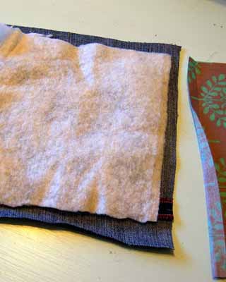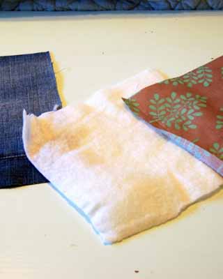 2. Coloca el cuadrado de vaquero con el reverso hacia arriba y pon encima el cuadrado de guata. Cubre con el cuadrado de tela estampada, con el reverso hacia abajo.