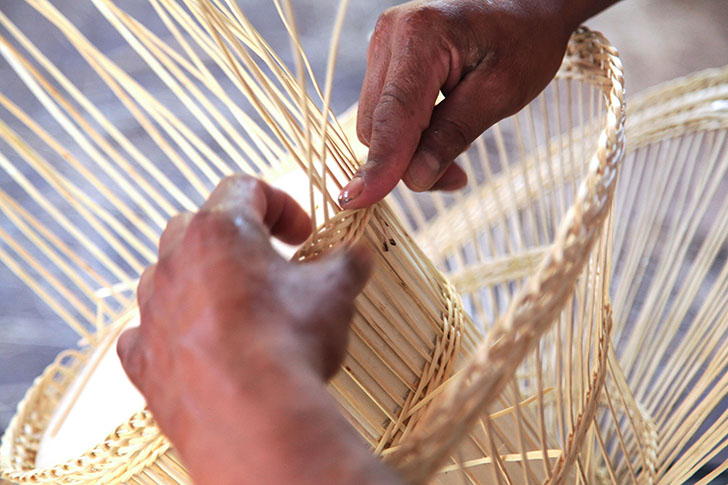 Los artesanos tejen la pantalla con fibras vegetales y la incorporan al cuerpo de la botella